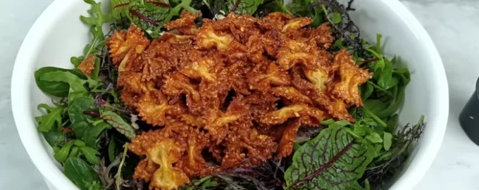 - Na tanier poukladajte listy šalátu, nakrájanú cibuľu, omáčku a na vrch položte chrumkavé cestoviny. Šalát premiešajte a je pripravený na konzumáciu.